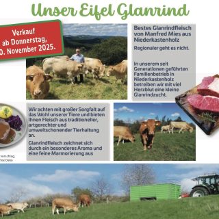 Fleisch aus Euskirchen Niederkastenholz ab Donnerstag 20. November… Nach dem großen Erfolg unserer regionalen Aktion mit dem Eifel Glan Rindfleisch der Familie Mies aus Euskirchen Niederkastenholz, werden wir die Aktion […]